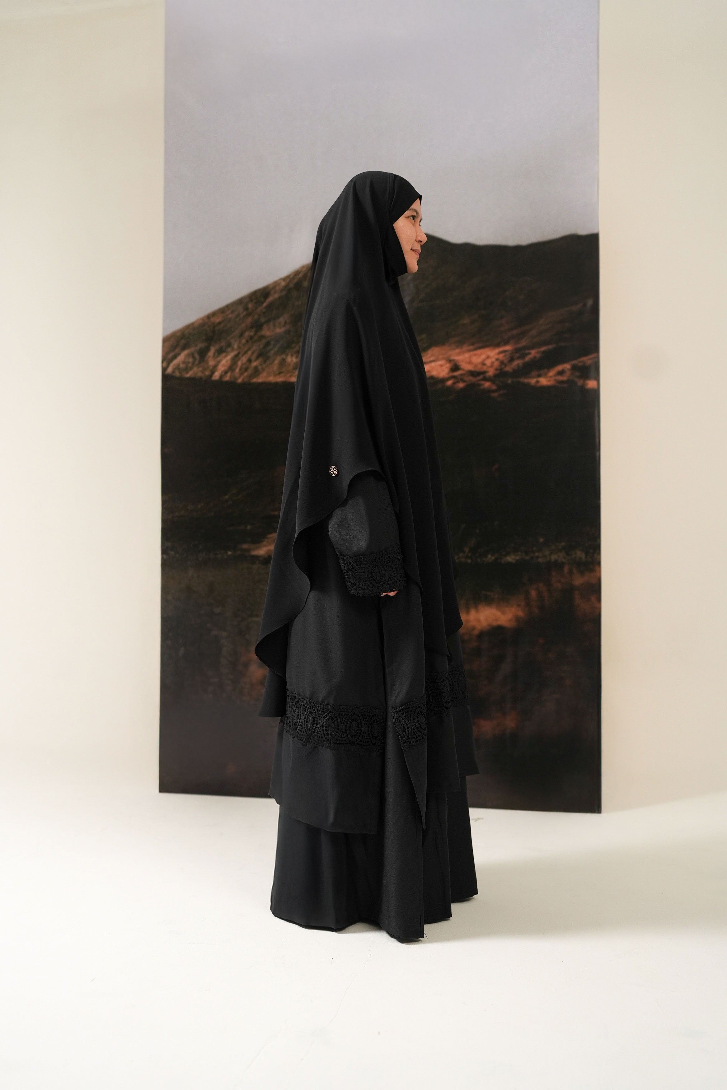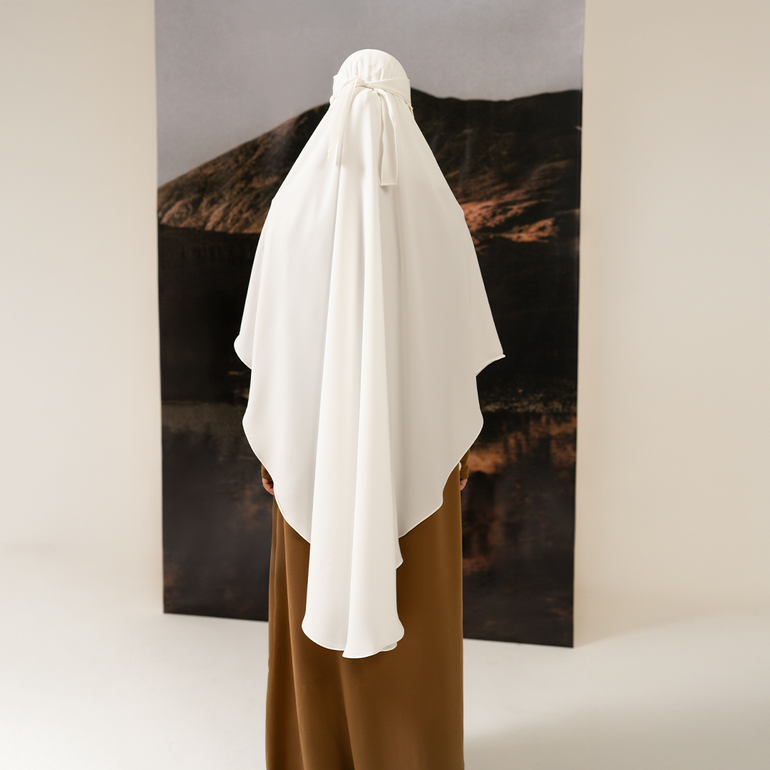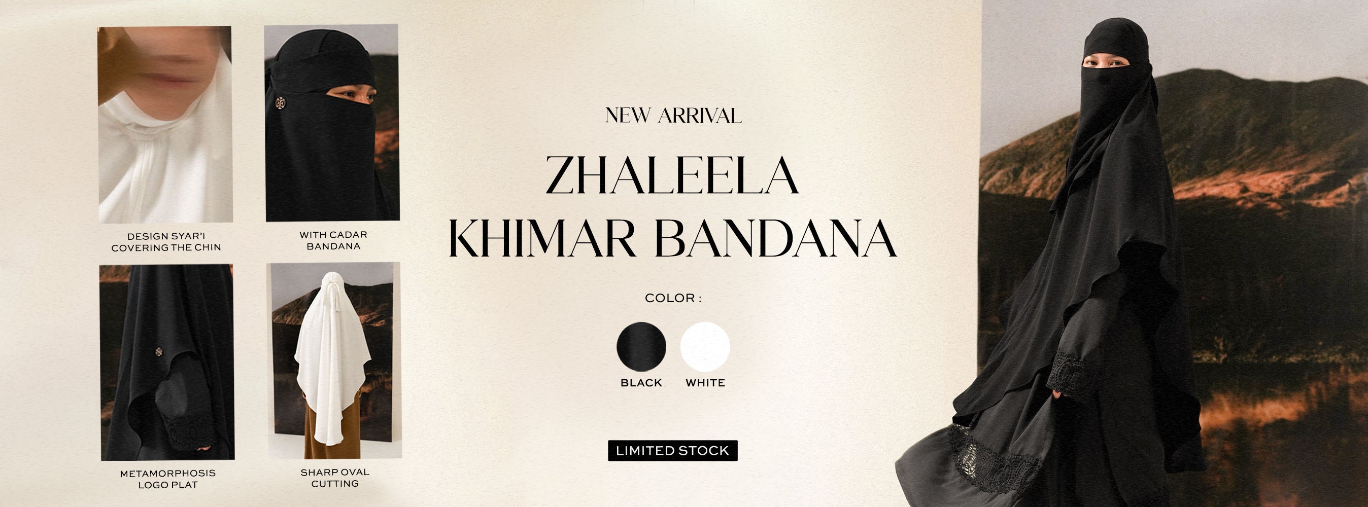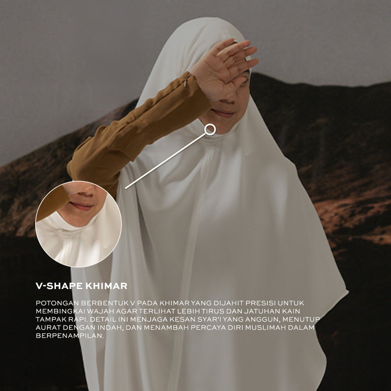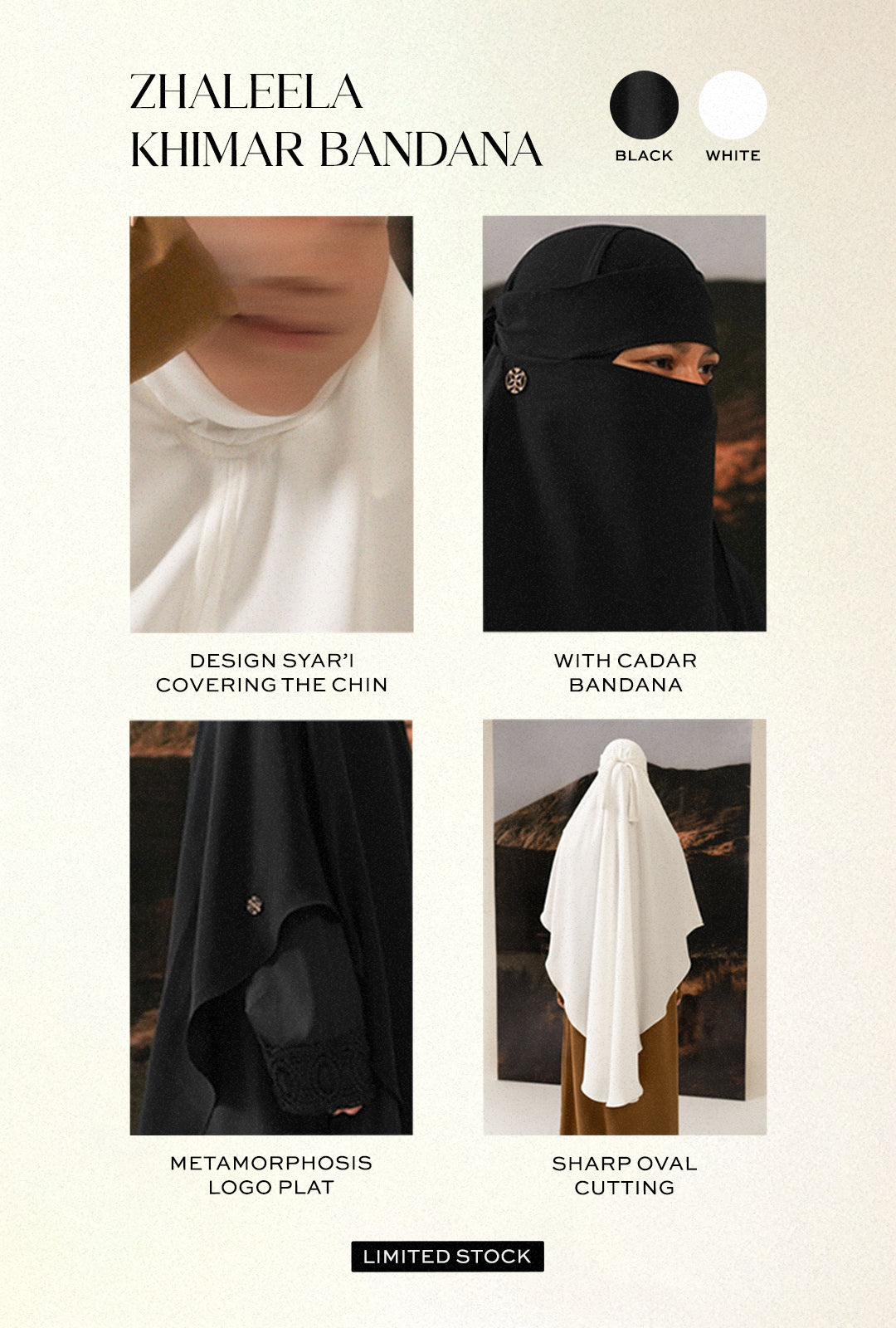 Khimar Bandana dengan cuttingan depan segitiga dan cuttingan belakang oval. Terdapat sambungan di bagian depan. Terdapat pad dagu yg lebar, membuat dagu jadi tertutup sempurna. Include niqob bandana.