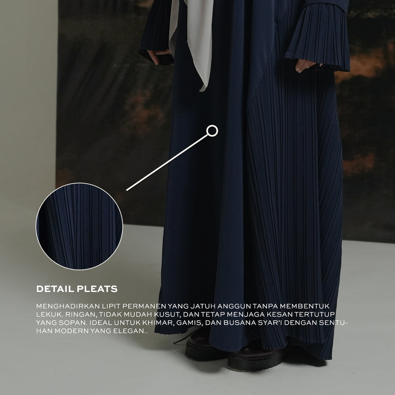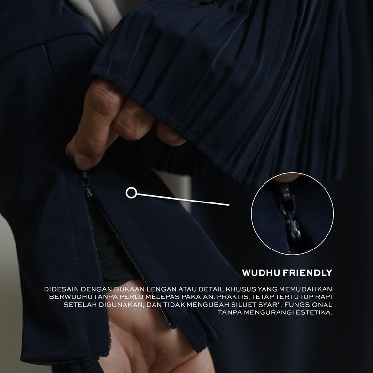 Dress kerah bulat dengan bukaan resleting depan sampai dada yang memudahkan pemakai untuk mengenakannya (busui friendly). dengan details pleats di samping kanan kiri dan dibagian pergelangan tangan terdapat details pleats beresleting dibawahnya juga plat berlogo gerai hawa sebelah kanan, untuk memudahkan pemakai mengenakannya (wudhu friendly), yang membuat tampilan dress semakin klasik dan menarik. Dress ini cocok dipakai untuk berbagai acara, seperti acara formal atau informal.