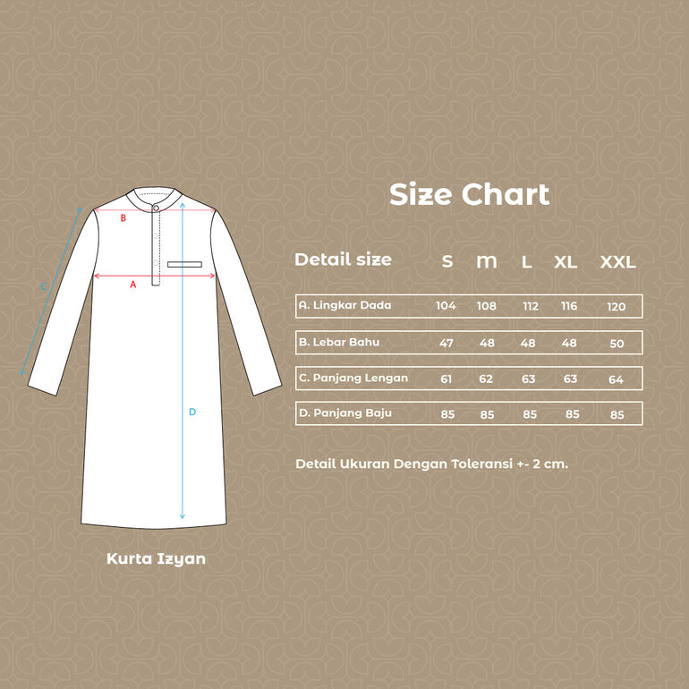 Kurta lengan panjang dengan aksen kerah shanghai bukaan kancing dalam sampai kebagian dada , terdapat kantong bobok di sebelah kiri, diatas kantong ada logo aksen bordir dan bukaan slit samping