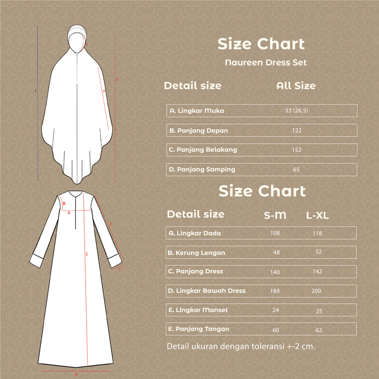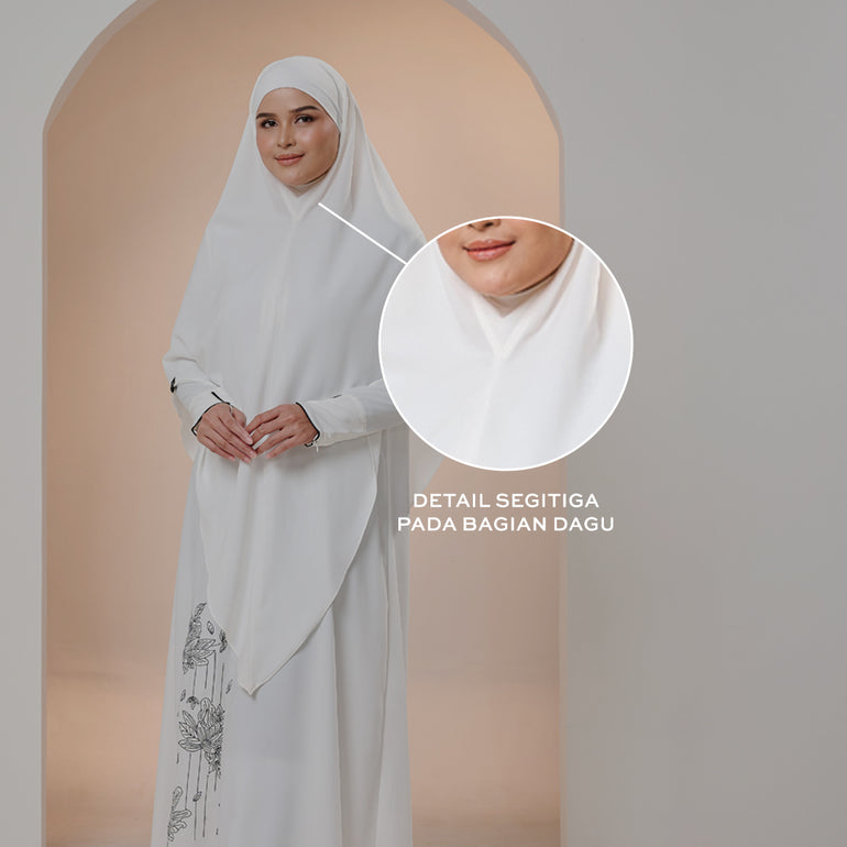 Dress kerah bulat dengan bukaan resleting depan sampai dada yang memudahkan pemakai untuk mengenakannya (busui friendly) dengan details motif bordir bunga di sebelah kanan badan, label logo arab GH dan lis bisban di bagian mansetnya dan detail tali cacing utk kaitkan ke jari, juga resleting dibawahnya untuk memudahkan pemakai mengenakannya (wudhu friendly). Dipadukan dengan French Khimar polos dengan details segitiga di bagian dagunya dan di sebelah kanan FK terdapat label logo arab Gerai Hawa. Dress ini cocok dipakai untuk berbagai acara, seperti acara formal atau informal.