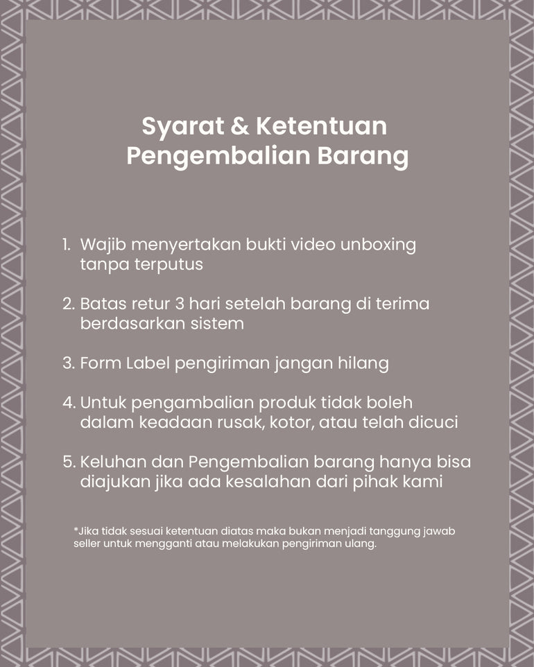 - Untuk retur produk tidak boleh dalam keadaan rusak, kotor, atau telah dicuci